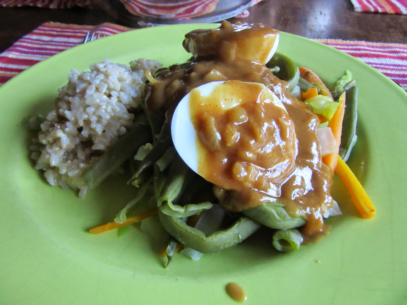 En dan op je bord een mooi stapeltje maken. Bergje groente, paar halve eieren erop, dan flink saus eroverheen gieten. Schep rijst erbij ... eetze!